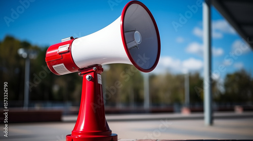 Eye-Catching Red and White Megaphone Stands Boldly Against a Vibrant Outdoor Backdrop Scene