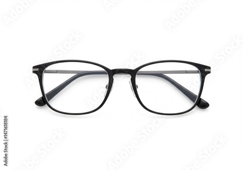 Eyeglasses with black frames and clear lenses on a white background
