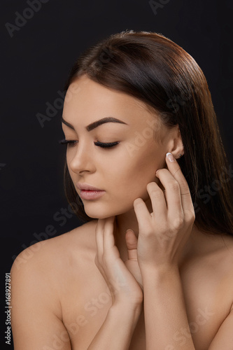 Eyelashes extensions. Fake Eyelashes. Closeup Of Beautiful Young Female Model With Soft Smooth Skin And Professional Facial Makeup. Portrait Of Sexy Girl With Long Fake Eyelashes And Perfect Make-up.