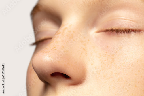 Eyelids, eyes closed. Close up portrait of beautiful caucasian female model. Parts of face. Beauty, fashion, skincare, cosmetics, wellness concept. Copyspace. Well-kept skin, fresh look, details.