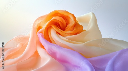 Fabric folds in pastel peach and pale lavender, creating a light, serene background