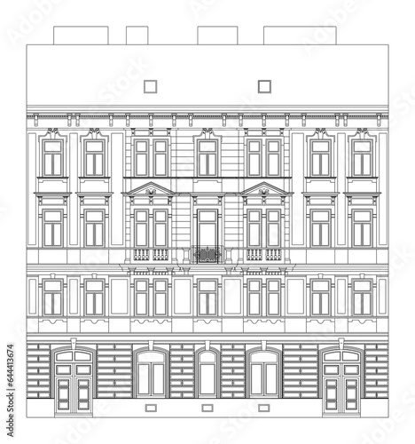 Facade of a 4 story townhouse in an European City around 1900. Drawing, true to scale.