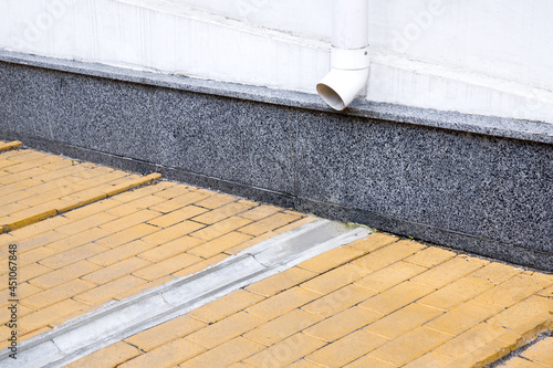 facade of a house wall with a drainage pipe and a concrete dish channel on a stone slab sidewalk to drain rainwater.