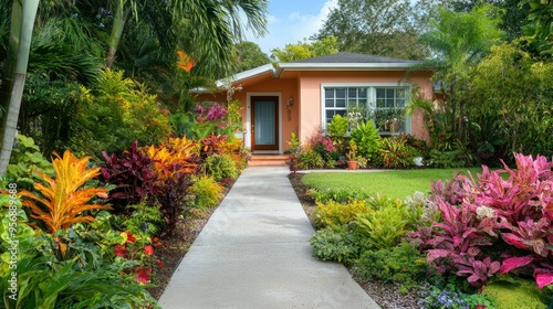 Facade of a house with a lush, colorful front yard garden, highlighted by a clean concrete walkway leading to the entrance. Ideal for landscaping and real estate projects.