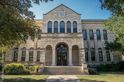 Façade of a Renaissance Revival courthouse with arched windows, detailed stone carvings, and classical proportions