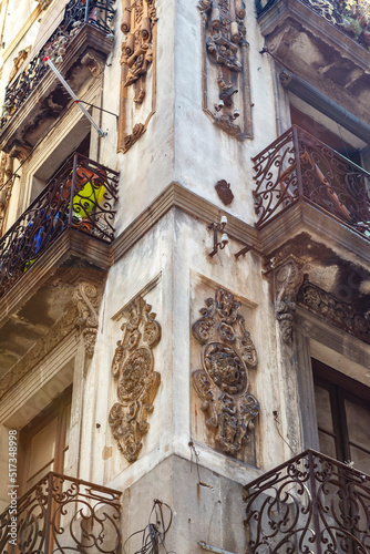Facade of an old apartment building in El Raval, Barcelona, Catalonia, Spain, Europe