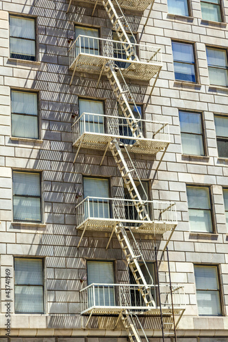 facade of historic skyscraper downtown Los Angeles with fire esc