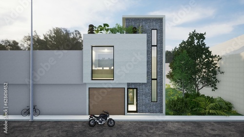 Facade of single-family homes with a minimalist style of stone and concrete materials, with a green exterior