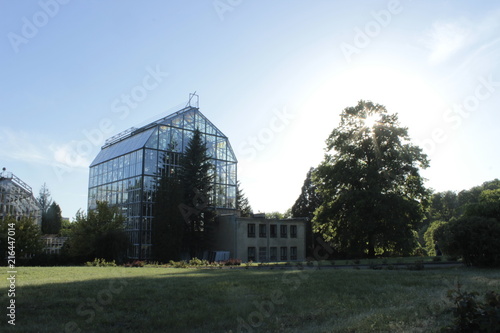 facade of the greenhouse in a botanical garden landscape with a tree