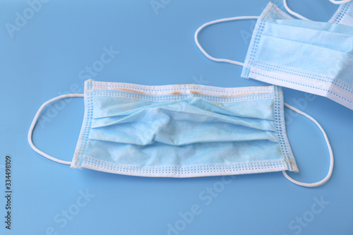 Face Mask Already in use Dirty with cosmetics isolated on light blue blackground for protection against protection coronavirus COVID-19 prevention of the spread of virus and pandemic