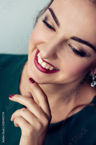 Face of a beautiful young girl with a clean fresh face close up.Brunette women with green eyses,red lips.