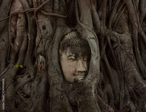 Face of Thai Buddha stuck among the branches in the ruins of ancient Thailand.
