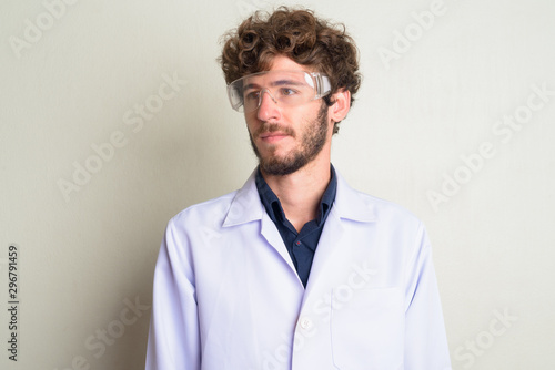 Face of young bearded man doctor as scientist with protective glasses thinking