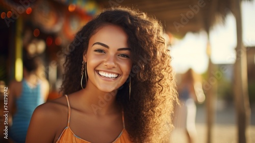 Face portrait of a happy Brazilian woman. Beautiful latina smiling young lady look at camera