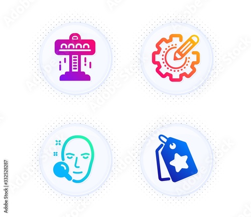 Face search, Attraction and Settings gear icons simple set. Button with halftone dots. Loyalty tags sign. Find user, Free fall, Technology process. Bonus reward. Business set. Vector