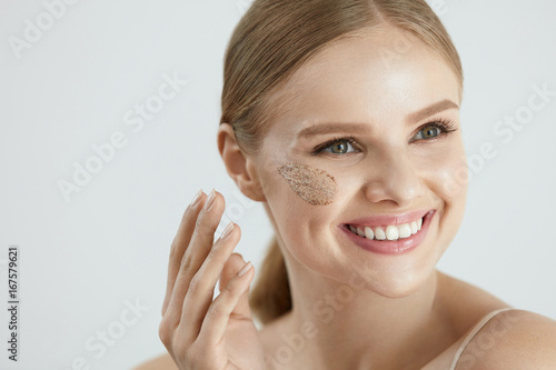 Face Skin Scrub. Smiling Female Applying Scrub On Face Skin