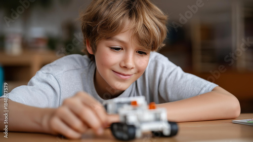 Faceless boy male teen child concentrate enjoy machine learning robot moving under control, robot coding at technology STEM class, education for digital automation artificial intel