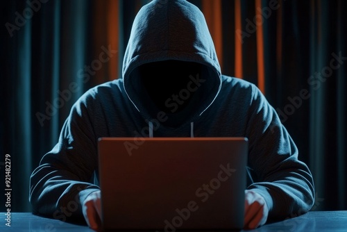 Faceless Hacker in Hoodie Using Laptop in Dark Room