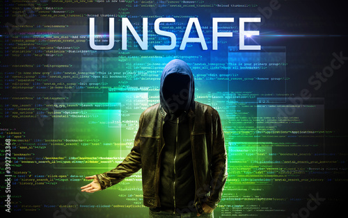 Faceless hacker with UNSAFE inscription on a binary code background