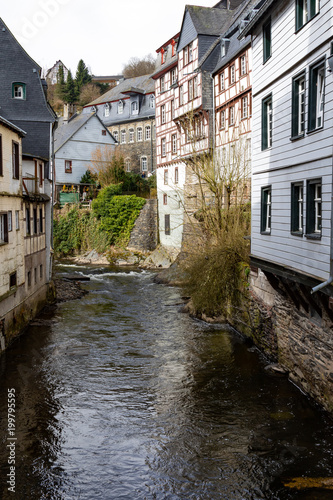 Fachwerkhäuser nahe eines kleinen Flusses in der Innenstadt von Monschau in der Eifel