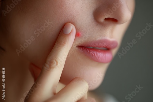 Facial close-up of a woman gently pressing on an inflamed pimple near her lips, vibrant red lipstick, minimal background, usable in skincare problem visuals or beauty advice articles.