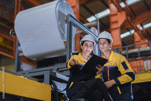 Factory apprenticeship. Man mentor teaching Female employees trainee operating machine looking monitors and check Production process machinery. foreman explaining woman engineer control machine .