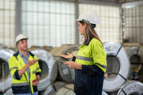 Factory apprenticeship. Man mentor teaching Female employees trainee operating machine looking monitors and check Production process machinery. foreman explaining woman engineer control machine .