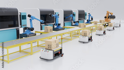 Factory Automation with AGVs, 3D printers and robotic arm,3D rendering