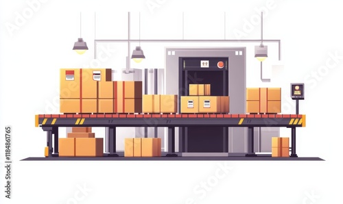 Factory, box and conveyor belt for product in manufacturing or distribution and delivery. Logistics, supplier and parcel or packaging in storehouse, wholesale and warehouse for shipp, Generative AI