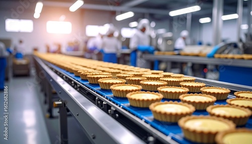 Factory conveyor belt with numerous golden-brown tarts moving towards the end of the line