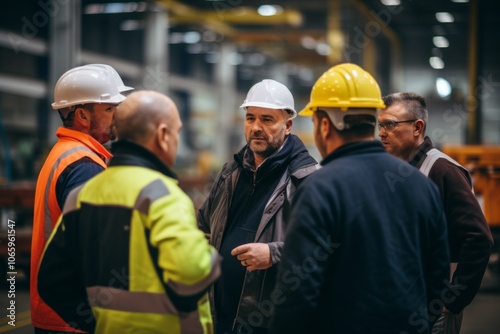 Factory employees having safety meeting in the factory