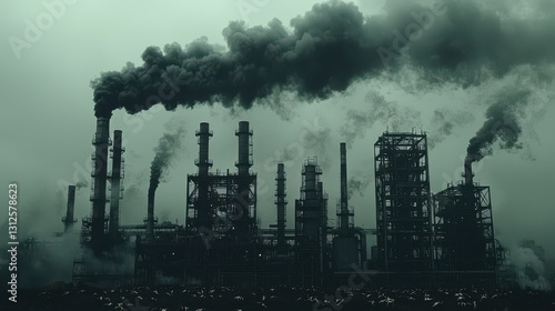 Factory pipe emits thick black smoke amid dead birds, highlighting environmental disaster