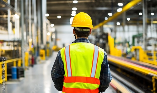 Factory Worker in Yellow Safety Vest and Helmet