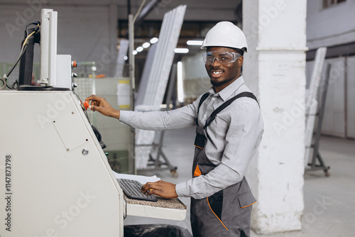 Factory worker operating machinery for aluminum and PVC windows and doors production