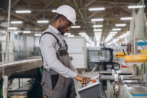 Factory worker operating machinery producing aluminum and pvc windows and doors