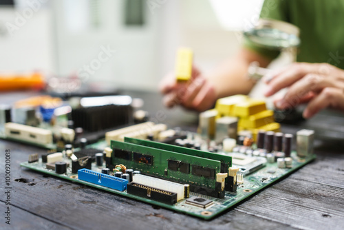 Factory worker overseas molten metal pouring into mold, surrounded by glowing heat in a steel foundry. Microchips and computer hardware components semiconductor and gold metal manufacturing.