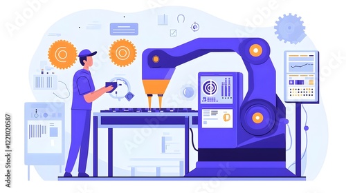 Factory Worker Wearing Blue Uniform Operating High-Tech Machinery in Industrial Environment