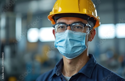 Factory worker wearing face mask, helmet, glasses. Protection from air pollution, virus, COVID-19. Health care, sanitary concept. Male engineer, technician at work, manufacturing job.