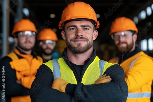 Factory workers in safety gear stand confidently before production lines showcasing industrial machinery