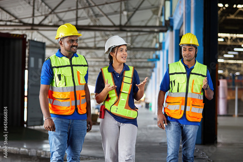 factory workers walking and talking about work or project in the warehouse storage