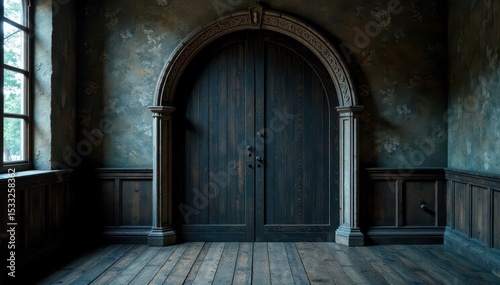 Faded silver filigree on dark wood, gothic archway backdrop, decay, metal