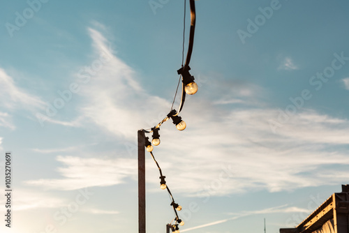 Fairy lights with illuminated light bulbs. Blue sky, sunset, summer.