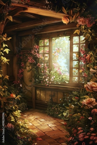 Fairy Tale Cottage. Quaint wooden beams, blooming flowers, and whimsical decorations. A blank, cozy cottage interior, evoking the charm and magic of a fairy tale