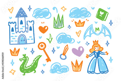 Fairytale Doodle: A whimsical collection of hand-drawn elements featuring a castle, dragon, princess, crown, and other fantasy symbols.