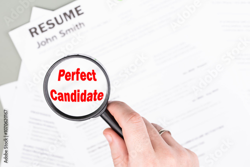 Fake mock CV (curriculum vitae) resume for John Smith, selected by HR as the perfect candidate for a job. Concept of job search, employee selection, recruitment process, work and hiring.