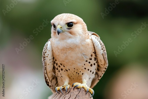 Falcon perched on wood, blurred green background