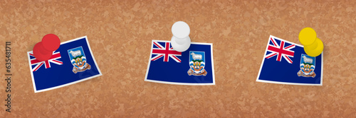 Falkland Islands flag pinned in cork board, three versions of Falkland Islands flag.