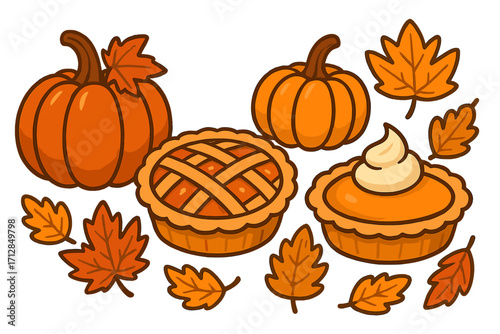 Fall harvest vector set with cute cartoon pumpkins, delicious pumpkin pies, and autumn leaves. Seasonal food illustration collection for Thanksgiving and festive holiday design.