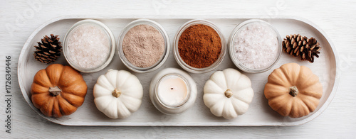 Fall Inspired Beauty Routine featuring spa salts, body scrub, and autumn pumpkins styled with candlelight on white wooden tray.