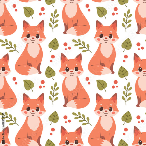 Fall pattern with fox. Seamless woodland pattern with leaves and cute forest animal on white background